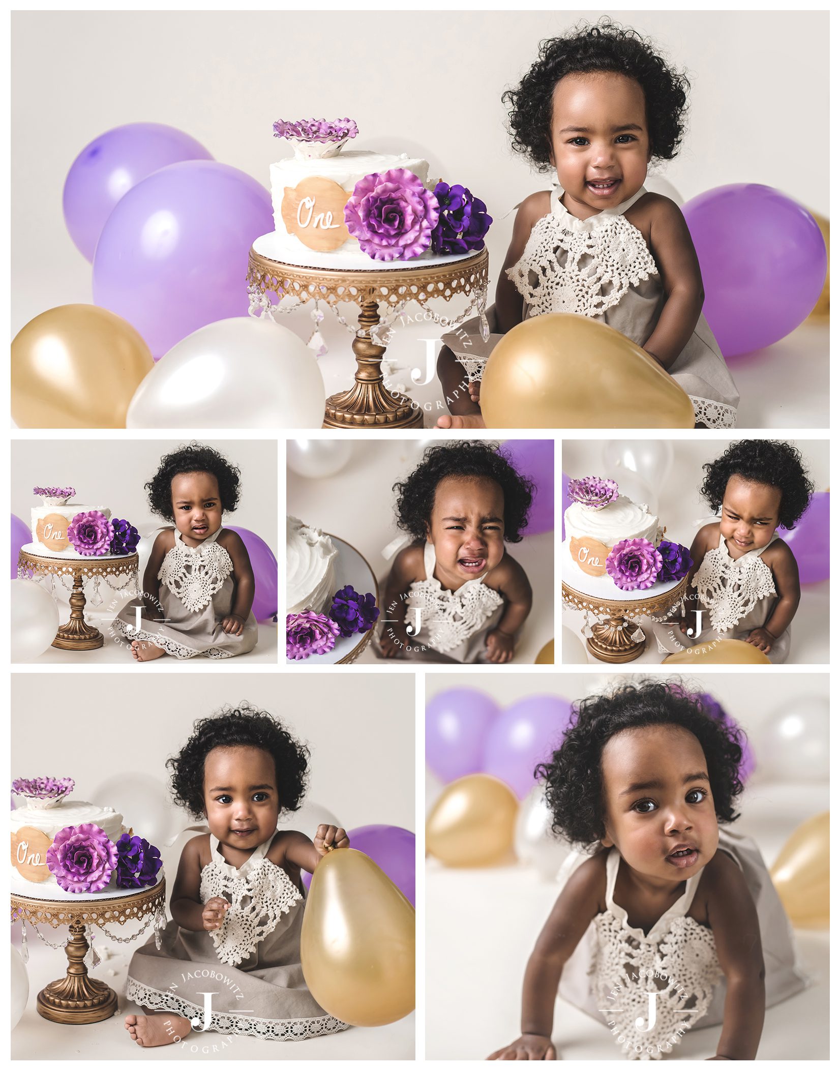 Danielle’s big sister, Brooke, had a pink and gold cake smash when she came to me a little over three years ago. I thought it to be fitting that their pictures would be please the eye side by side in any room. With that in mind, and staying true to my simplistic approach to cake smash photography, I designed Dani’s purple and gold cake smash set. Their mom, hoping to avoid future therapy sessions over who got the better cake, wisely opted to go with the same baker she had used for her first daughter’s cake smash session to make sure the cakes would be similar. Although I now supply the cake’s for my cake smash session, you always have the option of bringing you own.